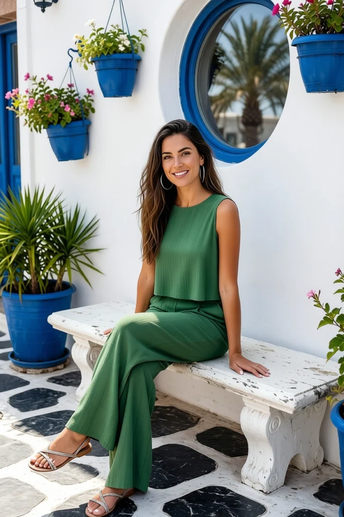 Sartorial Insight: Think of your Greek travel wardrobe as a movable canvas; while the white buildings provide the perfect neutral background, your choice of textures—from crochet and eyelet to silk and linen—adds the depth that brings your personal travel story to life.
